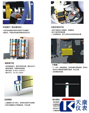 6、限位开关-机械,电子双重限位。机械限位螺钉可调,案例可靠;电子限位开关由凸轮机构来控制,简单的调整机构能精确并方便地设定位置,无需电池支持(微动开关接点均匀为银质触点)